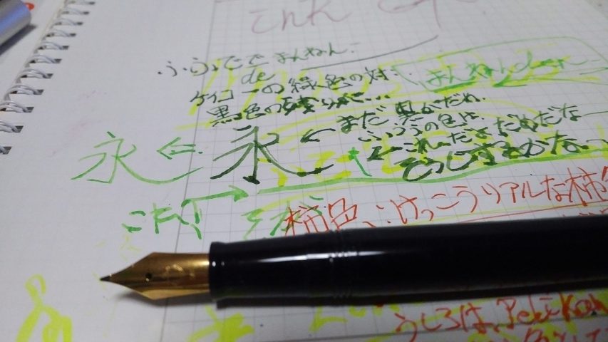 永の時の右は… 黒インク混じっちゃったけれども、左は純粋な蛍光の緑です… と言っても蛍光色より少し濃いって感じだね。