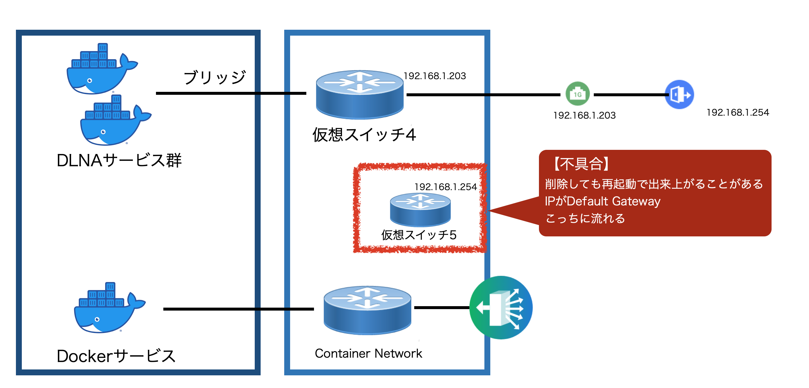 バグはDefault Gateway IPの仮想スイッチが自動で作られ通信がおかしくなります。